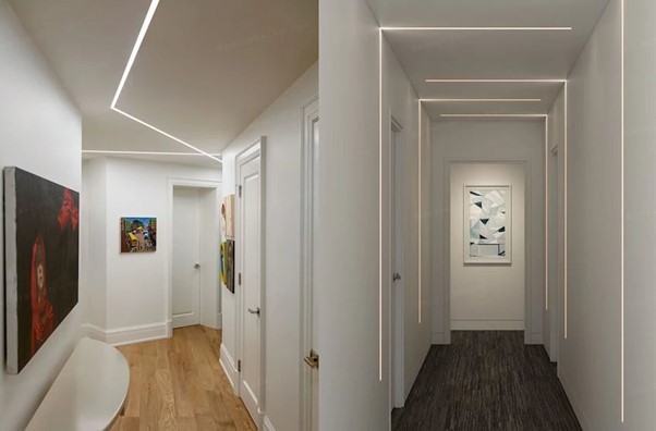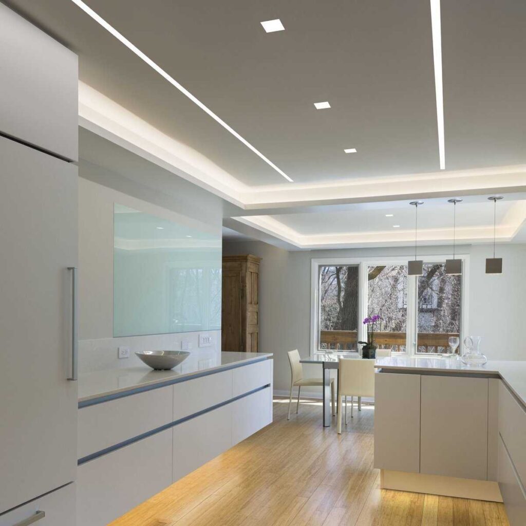 ایجاد یک دایره بزرگ کناف خطی سقف در وسط سقف با نوار نور خطی در اطراف آن، حس گرمی و مدرنیته را به فضا اضافه میکند. این طراحی به دلیل شکل منحصر به فردش، توجه هر بینندهای را جلب میکند و میتواند به عنوان نقطه کانونی در پذیرایی شما عمل کند. نور خطی در این طراحی به طور یکنواخت در اطراف دایره پخش میشود و جلوهای زیبا و دلنشین ایجاد میکند.