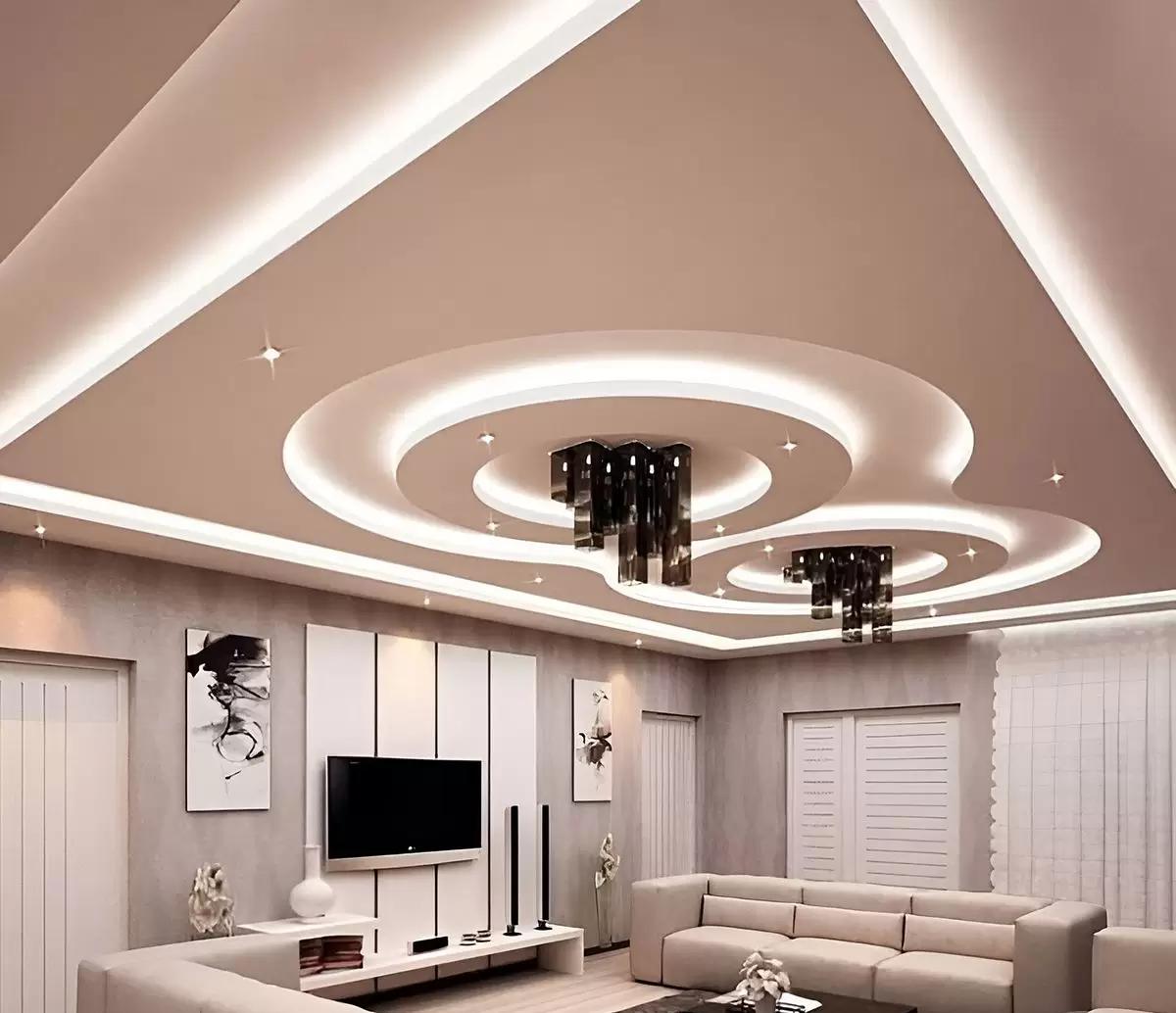 طرح مستطیلی یکی دیگر از گزینههای جذاب برای سقفهای پذیرایی است. در این طراحی، برشهای زاویهدار در وسط سقف و نور خطی در کنارهها قرار داده میشود. این طرح با ایجاد خطوط عمودی و افقی، فضایی پویا و مدرن به وجود میآورد. همچنین، نور خطی در این طراحی به توازن بصری کمک کرده و جذابیت بیشتری به فضا میبخشد.