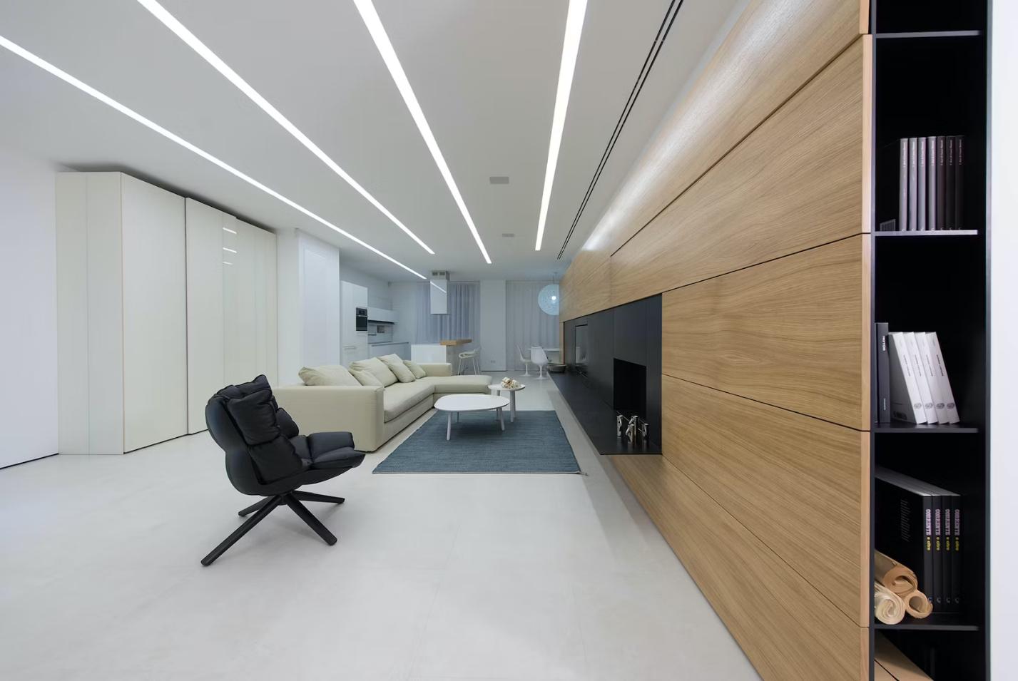 استفاده از برشهای زاویهدار در کناف با نور خطی که به سقف عمق و جذابیت بیشتری میبخشد، یکی دیگر از گزینههای جذاب برای طراحی داخلی و طرح کناف سقف خطی است. این طرح به دلیل خطوط زاویهدارش، نمایی مدرن و پویا ایجاد میکند. نور خطی در این طراحی به شکل هوشمندانهای درون برشها قرار میگیرد و جذابیت بیشتری به فضا میبخشد.