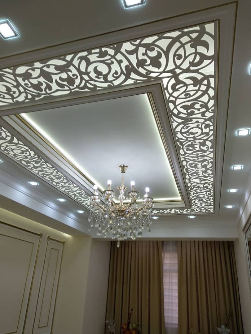 جدیدترین مدل سقف کاذب با طراحی معرق CNC اجرا میشود. این تایلها در طرحهای سنتی، اسلیمی یا مدرن با برشهای دقیق ساخته میشوند. نصب آنها معمولاً با نورمخفی ترکیب میشود.