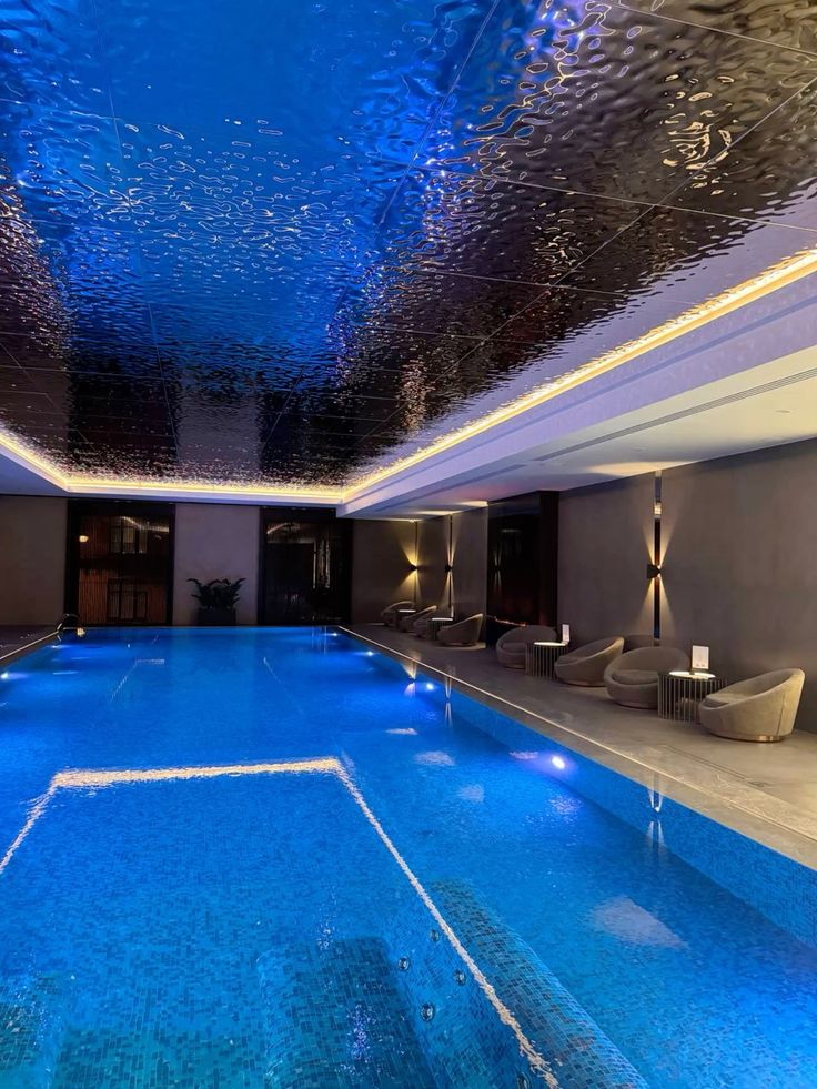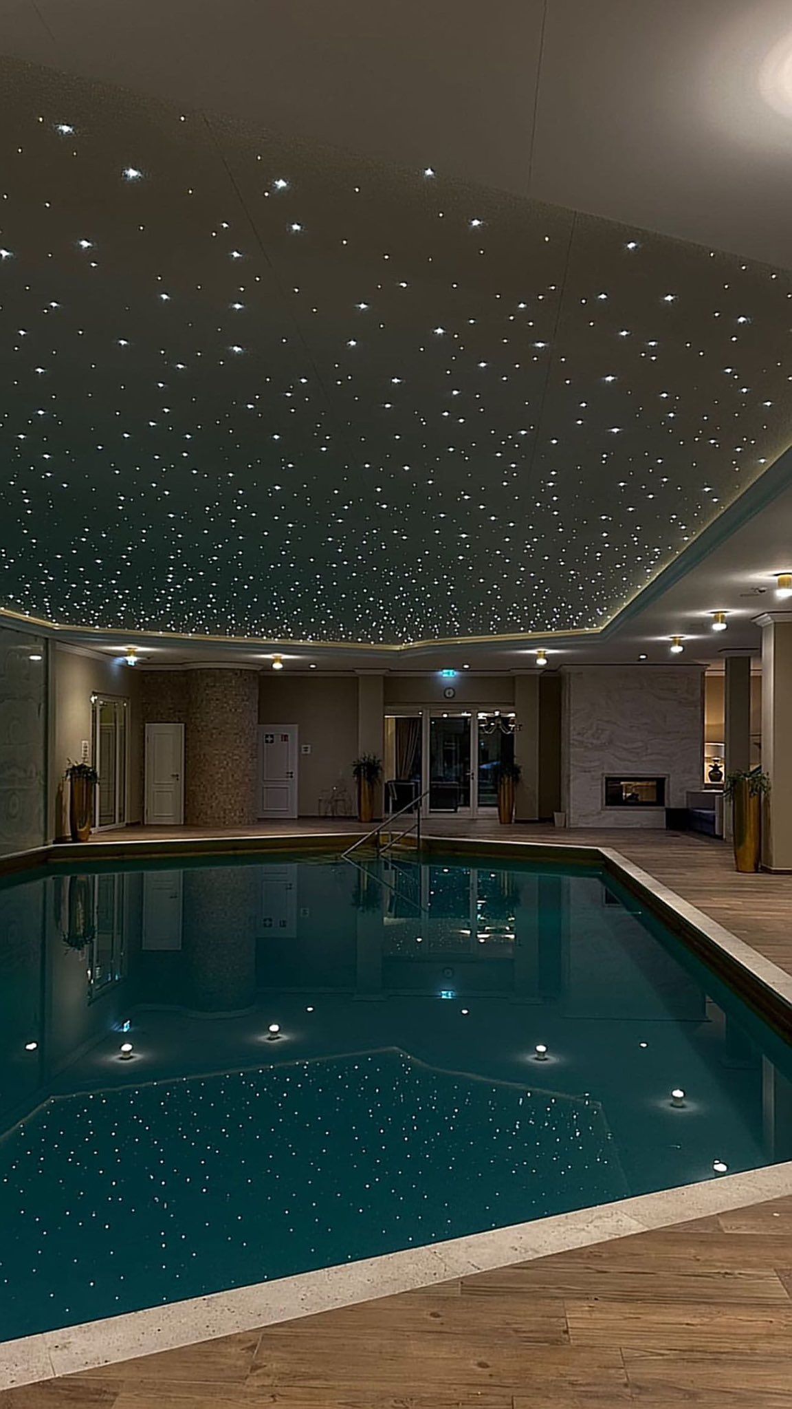 ترکیب هنر چاپ دیجیتال با نورپردازی آرامشبخش؛ مناسب فضاهای خاص. سقف آسمان مجازی جلوهای رؤیایی به استخر میدهد.